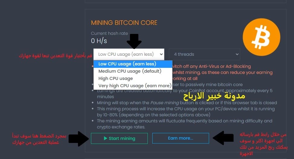 يمكنك هنا تحديد ال Hash او قوة التعدين بنفسك ( كلما زادت > زادت ارباحك > و زاد استهلاك موارد جهازك ).