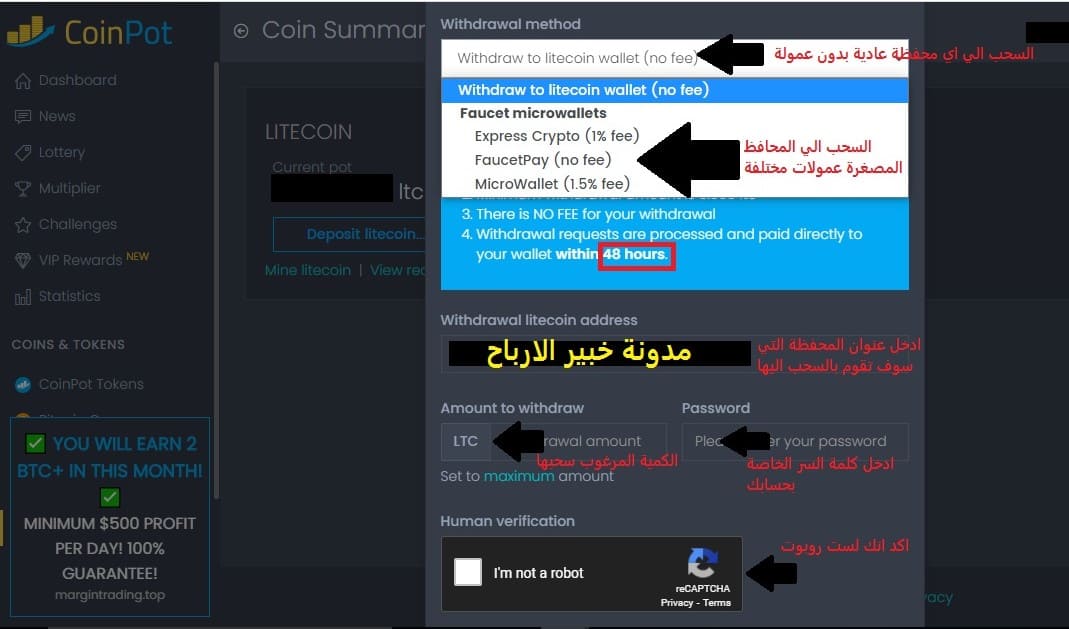 نأتي الان الي خيار السحب من محفظة coinpot , هذا الامر ايضا ليس بالشئ المعقد فقط اتبع تلك الخطوات و سوف تصل العملات الي حسابك.
