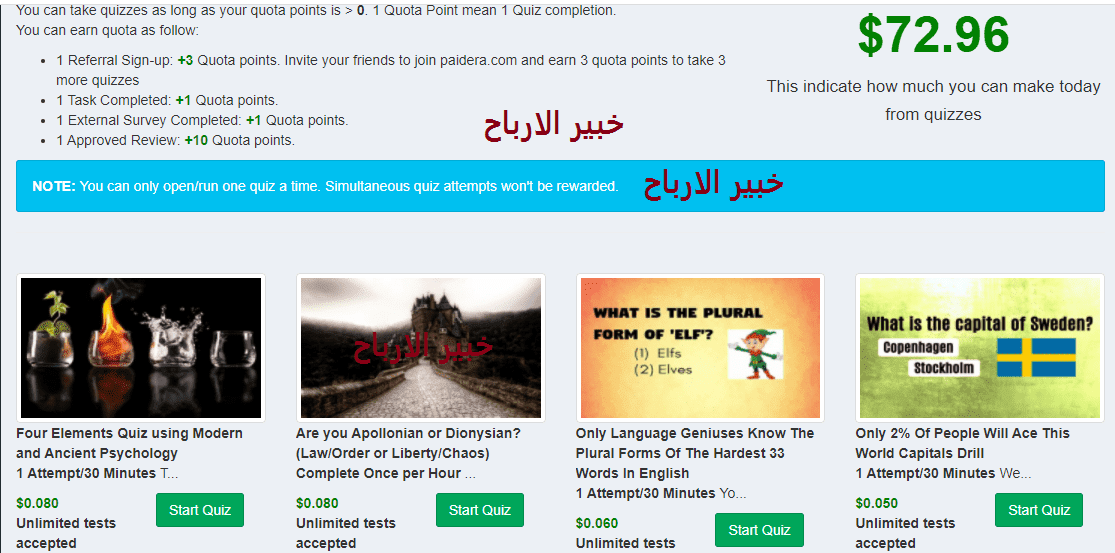 فكما تري في الصورة يمكنك ربح ما يقرب من 73 دولار اكمال تلك الكويزات البسيطة جدا>>>