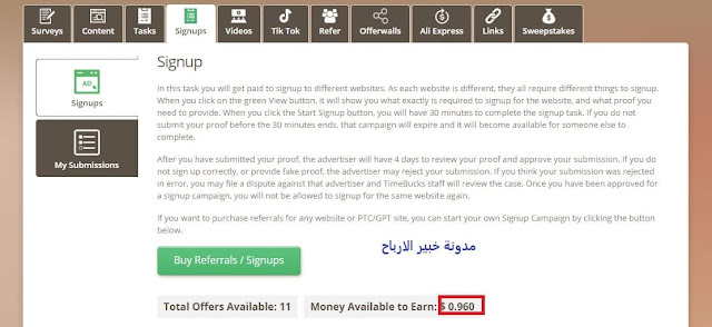 موقع Timebucks يعتبر من افضل المواقع من حيث عدد العروض و الطرق التي يمكنك الربح من خلالها و افضل طريقة لتزيد من ارباحك هي استخدام طريقتي ( التسجيل في المواقع – الاستطلاعات ) استخدام الطرق الاخري مثل العروض ايضا يقدم ارباح جيدة فيمكنك استعمال جميع تلك الطرق و الدمج بينها للحصول علي اعلي ارباح يومية .