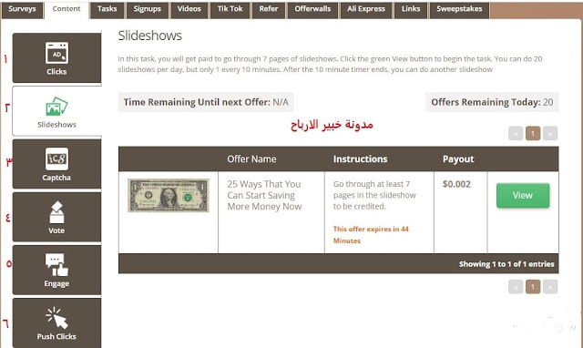 2- Slideshow : و هو كما موضح في الصورة بالاعلي تقوم بالضغط علي View ليتم تحويلك الي مقال مقسم الي 7 صفحات تقوم بالنزول للاسفل و تضغط علي زر Next باللون الاخضر حتي انتهاء الشرائح الربح كما هو موضح بالصورة 0.002 لكل مرة و متاح لك 20 مرة يوميا اي حوالي 0.04 دولار .